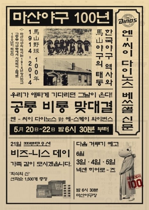NC는 20일~22일까지 마산구장에서 벌어지는 SK 와이번스와의 3연전 중 22일 경기에 ‘마산야구 100년 기념행사’를 진행할 예정이다.