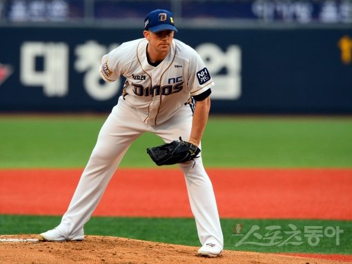 20일 저녁 창원 마산야구장에서 열린 프로야구 NC와 SK의 경기에서 NC 선발 투수 에릭이 투구에 앞서 포수 사인을 받고 있다.
