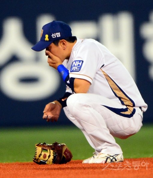20일 저녁 창원 마산야구장에서 열린 프로야구 NC와 SK의 경기에서 NC 유격수 손시헌이 5회초 2사 후 SK 타자 김강민의 내야땅볼때 수비 도중 타구에 얼굴을 맞고 그라운드에 앉아 있다.