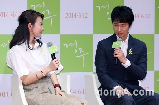 배우 신민아(왼쪽), 박해일이 21일 오전 서울 광진구 건대입구 롯데시네마에서 열린 영화 ‘경주’의 제작보고회에서 대사를 하고 있다.
