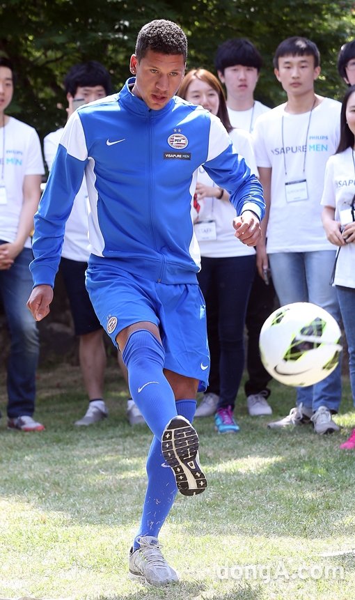 제프리 브루마 선수가 21일 오후 서울 용산구 그랜드하얏트서울에서 열린 ‘PSV 아인트호벤과 필립스 창단 100주년 기념행사’에서 슈팅을 하고 있다.