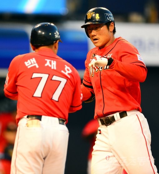 21일 저녁 창원 마산야구장에서 열린 프로야구 NC와 SK의 경기에서 SK 타자 박정권이 3회초 타석에서 홈런을 치고 덕아웃을 들어오며 백재호 코치의 축하를 받고 있다.