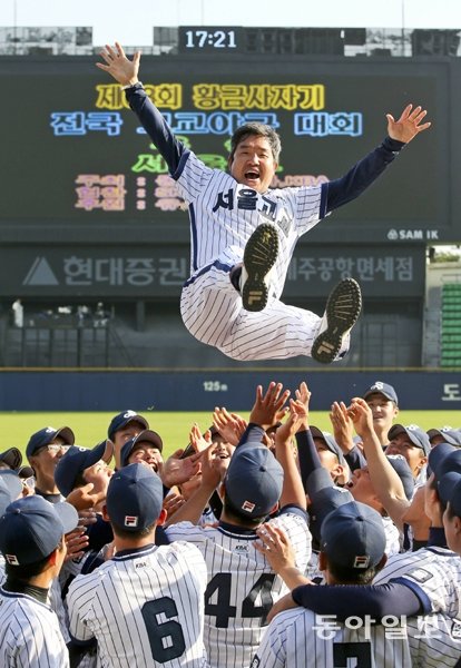 서울고가 21일 잠실구장에서 열린 제68회 황금사자기 전국고교야구대회 겸 주말리그 왕중왕전에서 용마고를 꺾고 우승을 차지했다. 서울고 김병효 감독이 우승한 뒤 헹가래를 받으며 활짝 웃고 있다. 잠실|변영욱 동아일보 기자 cut@donga.com