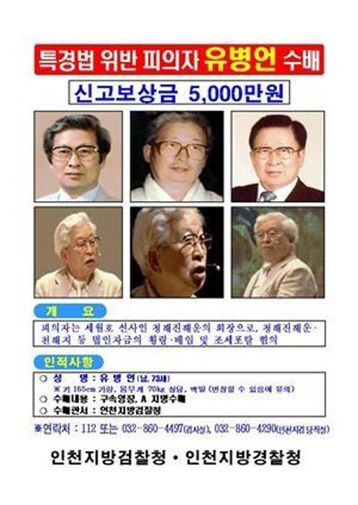 검찰이 유병언 전 세모그룹 회장을 전국에 지명수배하고 5000만원의 현상금을 내걸었다.