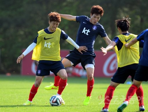 '2014 브라질월드컵' 사상 첫 원정 8강에 도전하는 축구국가대표팀이 22일 경기도 파주 NFC(축구대표팀 트레이닝센터)에 소집돼 훈련을 시작했다. 미니 연습경기가 펼쳐진 가운데 대표팀 이청용이 한국영의 수비를 피해 돌파하고 있다.