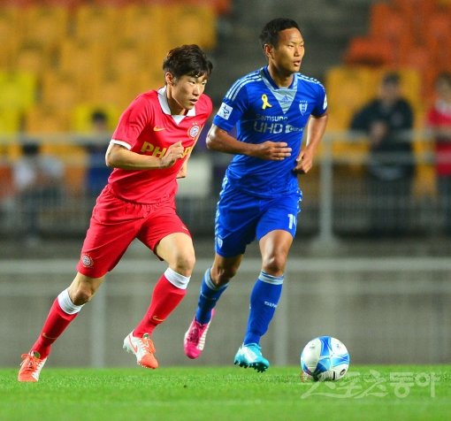 22일 저녁 수원월드컵경기장에서 열린 수원삼성과 PSV에인트호번의 친선경기에서 PSV 박지성이 공격을 하는 가운데 정대세가 수비를 들어오고 있다.