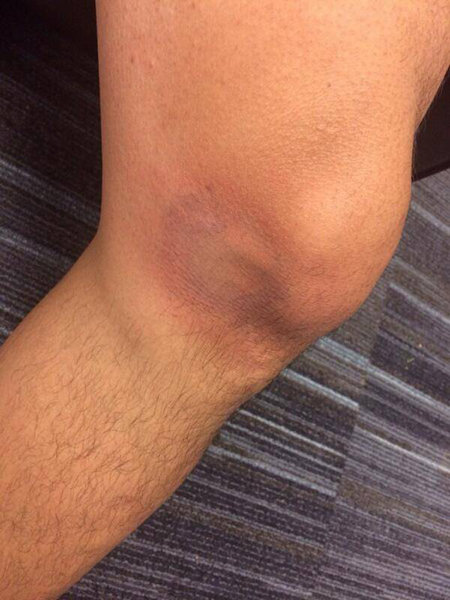윤석민(볼티모어 트리플A 노포크 타이즈)이 22일(한국시간) 경기 도중 타구에 무릎을 맞은 부위를 직접 찍어 트위터에 올렸다. 사진출처|윤석민 트위터