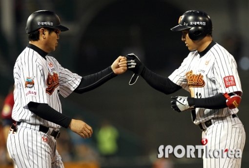 23일 오후 울산 문수야구장에서 열린 ‘2014 한국 야쿠르트 세븐 프로야구’ 롯데 자이언츠와 KIA 타이거즈의 경기 4회말 2사 1, 2루 상황에서 롯데 황재균이 1타점 선취 적시타를 치고 김응국 코치와 기쁨을 나누고 있다.