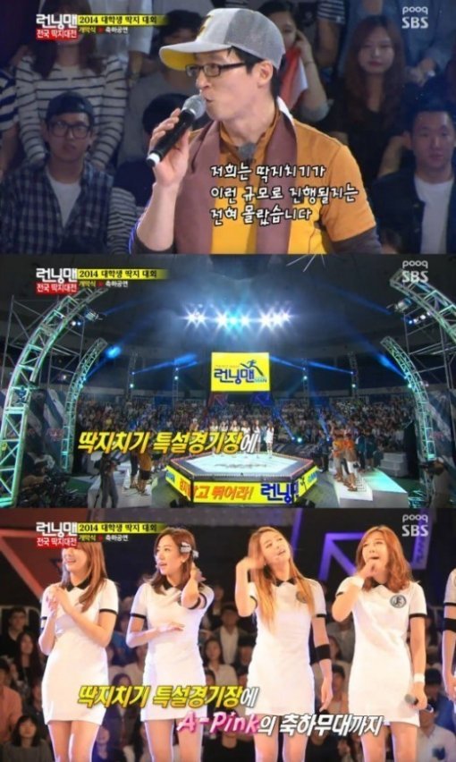 공연 도중 에이핑크 멤버들이 런닝맨 멤버에게 다가가자 마치 군대 위문공연에 온 듯 열화와 같은 성원이 쏟아졌다. 특히 멤버 유재석은 에이핑크 멤버들을 보며 함박웃음을 지어 모두를 폭소케 했다. 무대가 끝나고 유재석은 “딱지치기가 이런 규모로 진행될지 전혀 몰랐다”고 감탄했다.