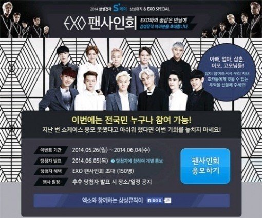 삼성뮤직은 ‘2014 삼성뮤직 S데이 삼성뮤직 & EXO SPECIA’ 엑소 팬 사인회를 진행한다고 밝혔다