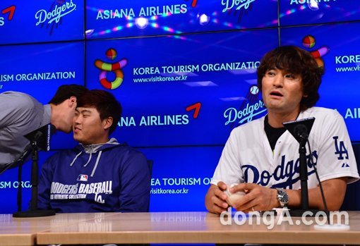 박찬호와 류현진이 기자회견장에서 기자들의 질문에 답하고 있다.