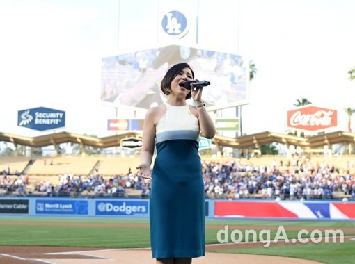 가수 알리가 28일(한국시간) 미국 캘리포니아 주 로스앤젤레스 다저스타디움에서 열린 메이저리그 LA 다저스와 신시내티 레즈의 경기에 앞서 미국 국가를 부르고 있다.