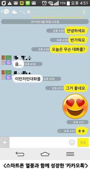 하지만 그 외에도 감각적이고 아기자기한 느낌의 인터페이스 및 쉬운 사용법 등은 한국인의 입맛에 부합하는 카카오톡의 장점이었다. 그리고 이용 요금이 무료라는 점과 때마침 한국에 불어 닥친 스마트폰 열풍에 힘입어 카카오톡은 폭발적으로 보급, 2014년 3월 기준 한국 내 가입자 3,500만 명, 해외 가입자 1억 명이라는 기록을 세우며 토종 모바일 메신저의 대명사로 등극했다.