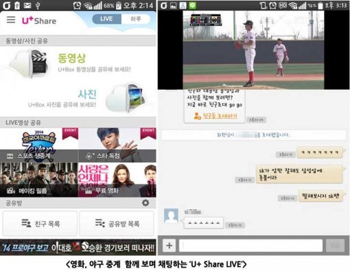 최근에는 클라우드 콘텐츠 서비스 역시 채팅과 결합을 시도하는 것에 주목할 만하다. LG유플러스(LGU+)에서 서비스하고 있는 '유플러스 박스(U+Box)'의 경우, 이용자가 저장한 동영상이나 사진, 혹은 온라인으로 서비스되는 프로야구 중계나 연예계 소식, 영화 등의 동영상을 등록된 친구와 함께 보면서 실시간 채팅을 나누는 '유플러스 쉐어 라이브(U+Share LIVE)' 기능을 제공한다.