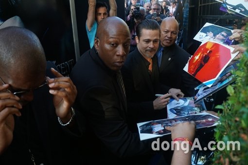 브래드 피트는 28일(현지시간) 미국 로스앤젤레스 엘 캐피턴 극장에서 열린 영화 ‘말레피센트’ 프리미어 시사회 레드카펫을 밟았다. ‘말레피센트’ 주연배우이자 아내인 안젤리나 졸리를 위해 행사에 참석한 것.