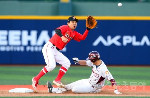 29일 저녁 서울 목동야구장에서 열린 프로야구 넥센과 SK의 경기에서 1회말 1사 1루 넥센 타자 유한준 타석때 1루 주자 이택근이 SK 2루수 나주환의 수비에 앞서 2루 도루를 하고 있다.