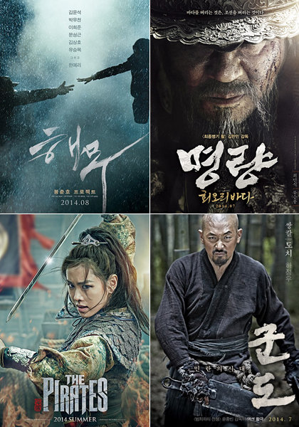 영화 ‘해무’, ‘명량:회오리 바다’, ‘군도:민란의 시대’, ‘해적:바다로 간 산적’ 포스터(왼쪽 위부터 시계방향으로). 사진제공|NEW·CJ 엔터테인먼트·쇼박스·롯데엔터테인먼트