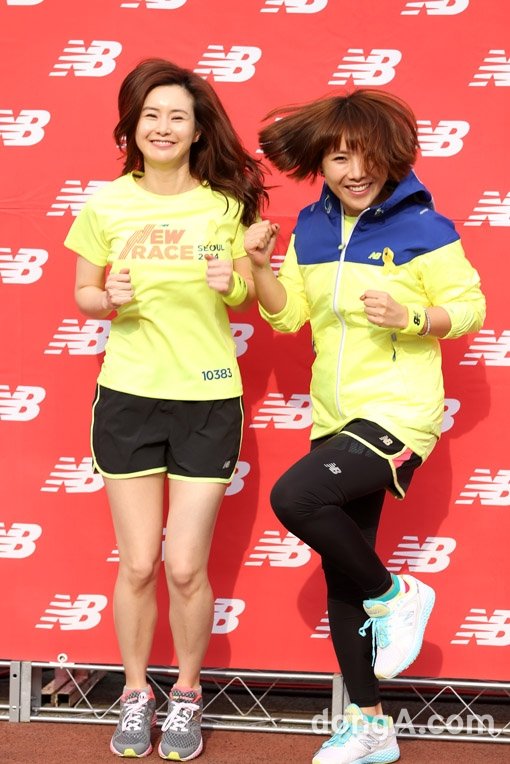 배우 최정윤(왼쪽)와 개그우먼 신봉선이 1일 오전 서울 잠실종합운동장 올림픽주경기장에서 열린 글로벌 스포츠 브랜드 뉴발란스마라톤 대회 '2014뉴레이스 서울'에 앞서 포토타임을 하고 있다.