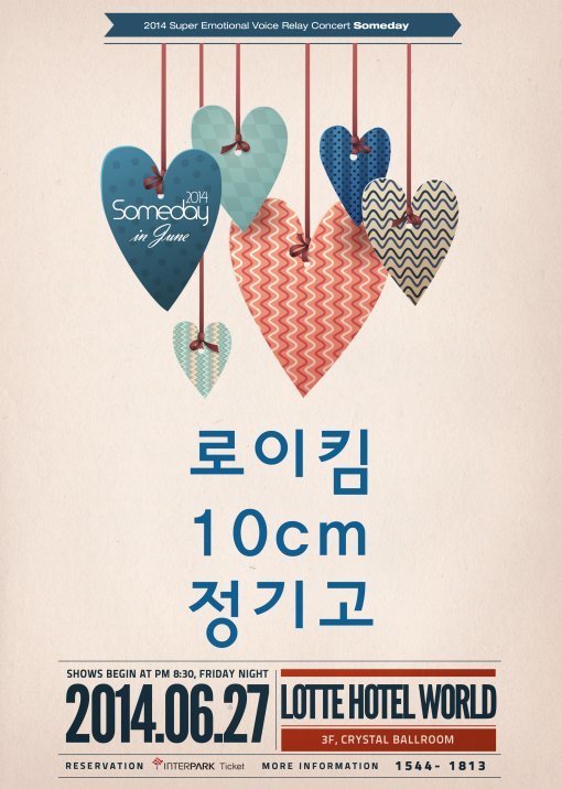 롯데호텔월드가 주최하고 에스에이커뮤니케이션이 주관하는 ‘2014 로이킴&십센치&정기고 콘서트-6월의 썸데이’는 2014년 상반기 뜨거운 관심을 모은 아티스트들의 첫 합동무대여서 팬들의 기대가 크다.