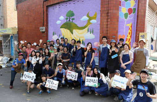 ‘한마음 벽화 그리기’는 대한항공이 SNS 회원들과 함께 하는 한마음 프로젝트의 하나이다. 통합 커뮤니케이션실 직원들을 비롯해 SNS회원, 벽화 그림 그리기 봉사를 펼치는 온라인 동호회 ‘드림 인 공존(Dream in 共존)’ 회원들이 함께 했다.
