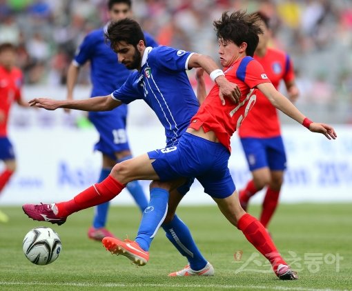 28년 만의 아시안게임 금메달을 노리는 U-23 한국 축구대표팀(감독 이광종)이 1일 오후 쿠웨이트와 인천아시아드주경기장 개장 기념 친선경기를 가졌다. 한국 이재성이 쿠웨이트 수비수와 볼다툼을 하고 있다.