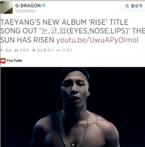 태양의 정규 2집 음원과 타이틀곡 ‘눈,코,입’ 뮤직비디오가 공개된 가운데 태양을 향한 지드래곤의 응원이 화제다.
