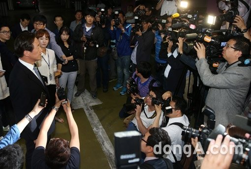 새누리당 정몽준 서울시장 후보가 4일 오전 서울 동작구 사당3동 제6 투표소에서 부인 김영명과 함께 투표를 마친 뒤 취재진과 인터뷰를 하고 있다.