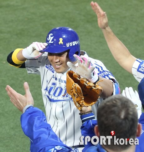 4일 오후 대구 시민야구장에서 열린 ‘2014 프로야구’ 삼성 라이온즈 대 KIA 타이거즈 경기 3회말 2사 1,3루에서 삼성 박석민이 KIA 선발 한승혁을 상대로 좌월 스리런을 쳐 홈을 밟은 후 덕아웃 동료선수들의 환영을 받고 있다.