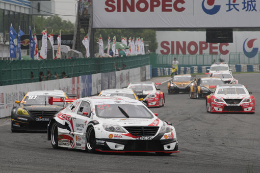 8일 중국 상해 티엔마 서킷에서 열린 슈퍼6000클래스 3라운드 경기에 출전한 스톡카들이 서킷을 역주하고 있다. 우승은 전 F1 드라이버 이데 유지가 차지했다. 사진제공|CJ슈퍼레이스