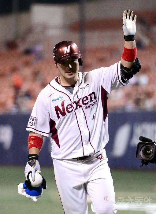 8일 서울 목동야구장에서 열린 2014 한국야쿠르트 세븐 프로야구 넥센히어로즈 대 두산베어스 경기 9회말 무사 넥센 박병호가 좌월 솔로 홈런을 날리고 홈인해 팬들을 향해 손을 흔들고 있다.