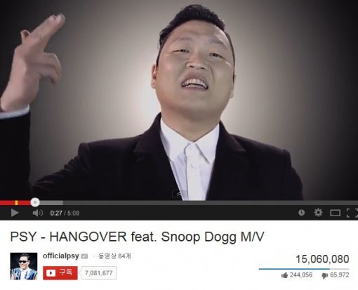 가수 싸이(37·본명 박재상)의 신곡 ‘행오버(Hangover)’ 뮤직비디오가 공개 약 26시간 만에 유튜브 조회수 1500만 건을 돌파했다.