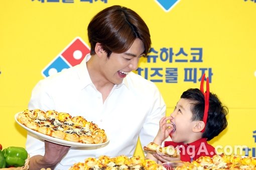 배우 김우빈이 10일 오전 서울 세종문화회관에서 열린 도미노피자 신제품 ‘슈하스코 치즈롤 피자’를 소개하는 포토타임을 하고 있다.