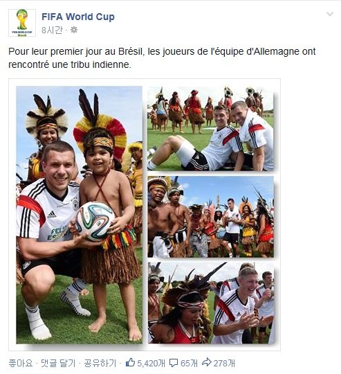 국제축구연맹(FIFA)은 10일(이하 한국시간) 공식 월드컵 SNS를 통해 “브라질에서의 첫 날, 독일 대표팀 선수들은 인디언 부족을 만났다”라는 글과 함께 사진을 게재했다.