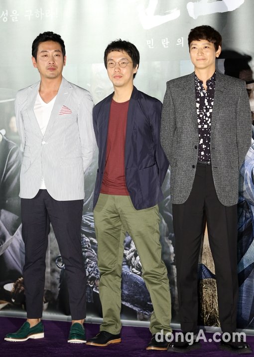 배우 하정우, 감독 윤종빈, 강동원이 10일 오전 서울 강남구 코엑스 메가박스에서 열린 영화 군도 민란의 시대 제작보고회에 참석해 포토타임을 하고 있다.