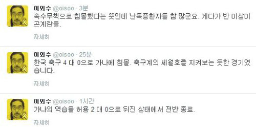 누리꾼들은 "이외수 축구 가나전을 세월호에 빗댄건 무리", "세월호와 축구 비교는 좀 그렇다", "이외수 가나전 비유를 왜 하필 세월호로…", "이외수 가나전 트윗, 곤계란 뜻이 뭐지?" 등의 반응을 보였다.