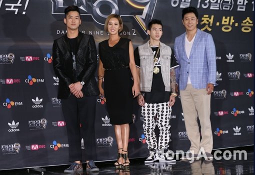 이용우(왼쪽부터), 박지은, 박재범, 김수로가 10일 오후 서울 마포구 CJ E&M에서 열린 케이블채널 Mnet ‘댄싱9’ 시즌2 제작발표회에서 포토타임을 하고 있다.