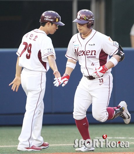 10일 오후 서울 목동야구장에서 열린 ‘2014 프로야구’ 넥센 히어로즈 대 삼성 라이온즈 경기 2회말 넥센 선두타자 윤석민이 삼성 선발 밴덴헐크를 상대로 솔로홈런을 친 후 그라운드를 돌며 최만호 3루코치의 환영을 받고 있다.