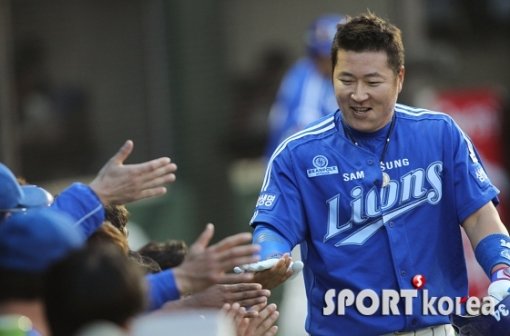10일 오후 서울 목동야구장에서 열린 ‘2014 프로야구’ 넥센 히어로즈 대 삼성 라이온즈 경기 3회초 삼성 선두타자 최형우가 넥센 선발 소사를 상대로 동점 솔로홈런을 쳐 홈을 밟은 후 덕아웃 동료선수들의 환영을 받고 있다.