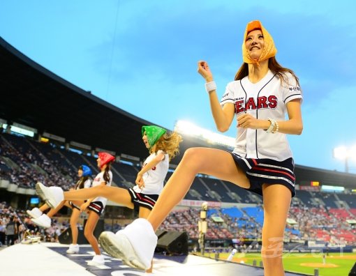 10일 저녁 서울 잠실야구장에서 열린 프로야구 두산과 NC의 경기에서 두산 치어리더가 세월호 사건 이후 첫 공연을 펼치며 관중들의 응원을 유도하고 있다.