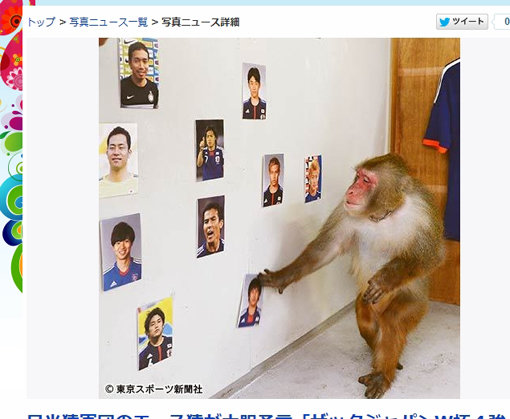 일본 유명 관광지 닛코의 명물인 ‘원숭이군단’의 에이스로 꼽히는 에이타로에게 설문조사를 실시했다. 일본이 조별리그에서 맞붙는 코트디부아르, 그리스, 콜롬비아와의 경기 성적과 각 경기의 키 플레이어, 첫 골의 주인공을 찍어달라고 요청했다. 예언은 벽에 붙은 사진을 에이타로가 집어내는 방식으로 진행됐다.