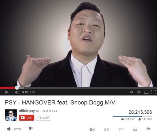 가수 싸이(37·본명 박재상)의 신곡 ‘행오버(Hangover)’ 뮤직비디오가 공개 이틀(48시간) 만에 유튜브 조회수 2800만 건을 돌파했다.