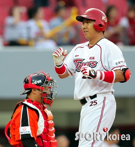 11일 오후 광주-기아 챔피언스필드에서 열린 ‘2014프로야구’ KIA 타이거즈와 한화 이글스의 경기에서 KIA 5번 이범호가 2회말 무사 1루 때 비거리 115미터 좌월 투런홈런을 터뜨리고 홈인하고 있다. 2,100루타에 -2를 기록하고 있었던 이범호는 이 홈런으로 통산 33번째 2,100루타를 달성한 주인공이 됐다.