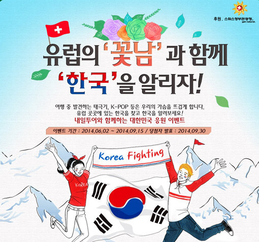 여름 여행시즌 해외로 나가는 배낭족들을 겨냥한 이색 이벤트도 있다. 자유여행 전문여행사 내일투어는 9월15일까지 ‘유럽의 꽃남과 한국을 알리자’를 실시한다. 여행상품에 SBS ‘런닝맨’ 스타일의 미션을 가미한 이색 이벤트다. 유럽 배낭여행의 인기 방문국인 스위스의 여러 관광명소에서 엑스맨처럼 활동하는 6명의 꽃미남급 외국인 친구를 찾아 인증샷을 찍고 내일투어 홈페이지에 올리면 된다. 이들은 태극기 뱃지, 한지 부채, 장구 열쇠고리 등 한국을 상징하는 물건을 지니고 있어 스위스를 찾는 전 세계 여행자들을 대상으로 한국 알리미 역할도 하고 있다. 꽃미남 친구들의 연령대와 활동 지역, 난이도가 각각 달라 해외여행에서 마치 게임을 하는 듯한 재미를 느낄 수 있다.