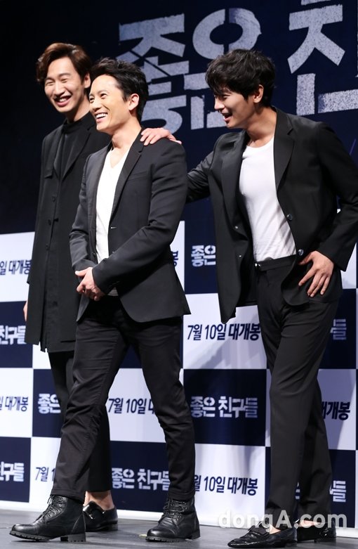 배우 이광수, 지성, 주지훈(왼쪽부터)이 12일 오전 서울 강남구 CGV 압구정점에서 열린 영화 ‘좋은 친구들’ 제작보고회에 참석해 포토타임을 하고 있다.