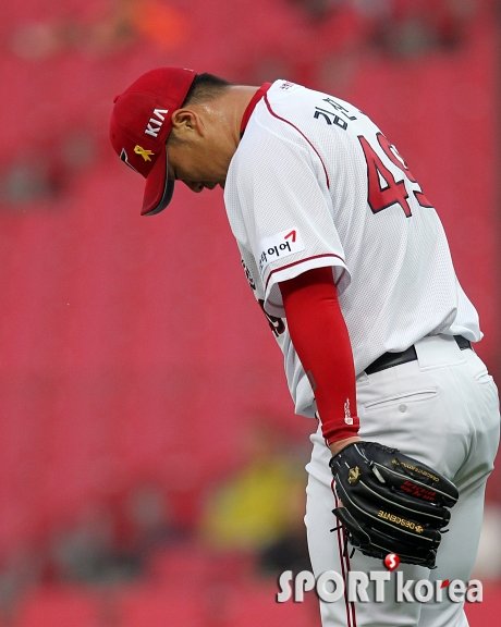 12일 오후 광주-기아 챔피언스필드에서 열린 ‘2014프로야구’ KIA 타이거즈와 한화 이글스의 경기에서 KIA 선발 김진우가 2회초 2사 1,2루 때 한화 정근우에게 적시타를 맞으며 실점을 한 뒤 고개를 떨구고 있다. 김진우는 올 시즌 6경기에서 1승 1패와 평균자책점 6.18을 기록하고 있다.