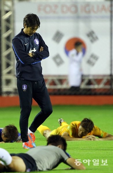 브라질 월드컵에 출전하는 축구국가대표팀 베이스캠프인 브라질 포즈 도 이구아수 플라멩고 훈련장에서 홍명보 감독이 선수들이 몸을 푸는 사이 생각에 잠겨 있다. 동아일보 양회성 기자 yohan@donga.com