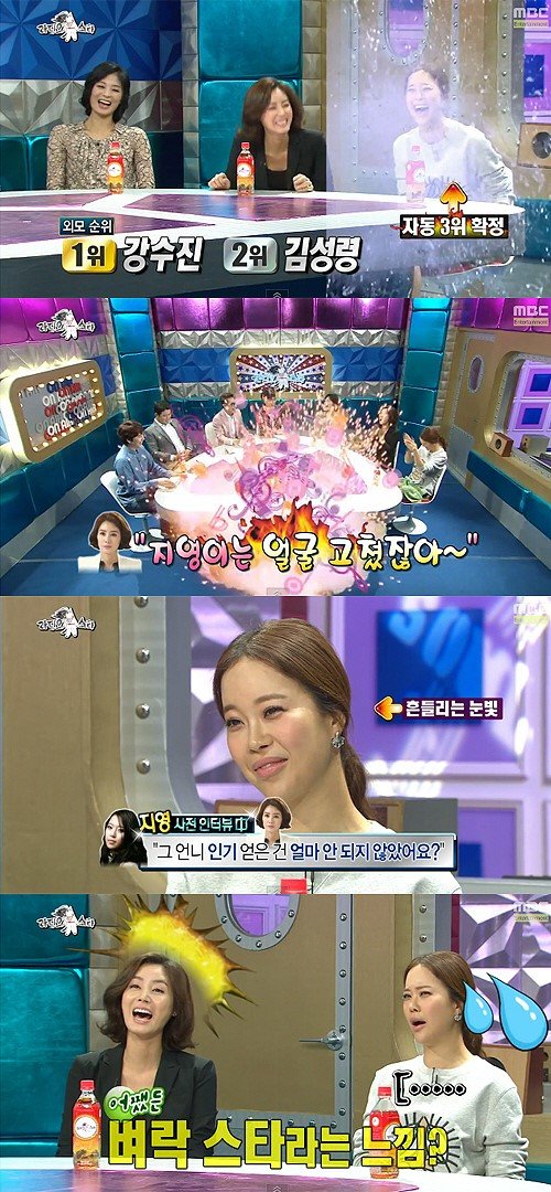 MC 윤종신은 이러한 외모순위의 이유를 설명하며 “김성령이 ‘지영이는 얼굴 고쳤잖아’라고 했다”고 폭로해 스튜디오를 초토화시켰다.