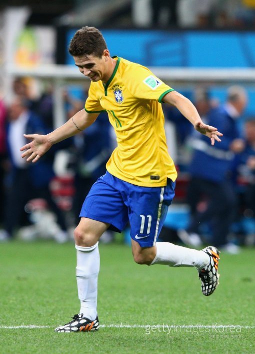 브라질의 오스카가 13일(한국시간) 브라질 상파울루의 코린치앙스 경기장에서 열린 2014 브라질 월드컵 크로아티아와의 개막전에서 후반 추가시간 쐐기골을 터뜨린 뒤 세리머니를 하고 있다.