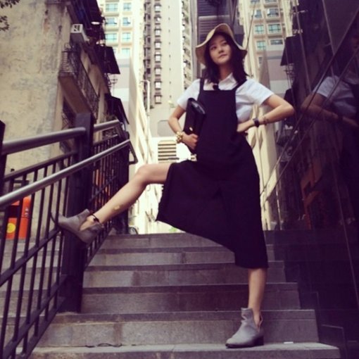 공개된 사진 속 모델 강승현은 소녀 느낌이 물씬 풍기는 검은색 멜방 원피스에 흰 셔츠를 받쳐 입고 계단 위에서 자신감 있는 포즈와 새침한 표정을 연출했다.