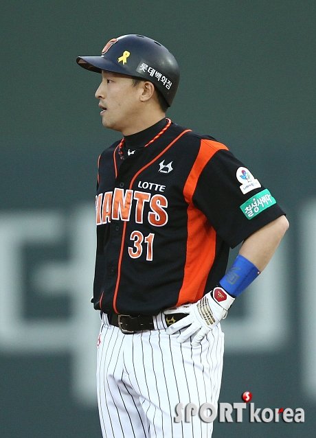 13일 오후 부산 사직구장에서 열린 ‘2014 한국 야쿠르트 세븐 프로야구’ 롯데 자이언츠와 KIA 타이거즈의 경기 1회말 무사 1, 2루 상황에서 롯데 손아섭이 1타점 인정 2루타를 친 후 아쉬워하고 있다. 손아섭의 타구는 좌측 펜스에 끼어 인정 2루타로 처리됐다.